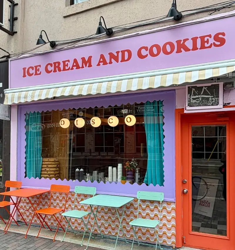 Disco Ice Cream & Cookies is a Toronto-based dessert shop founded in 2023 by co-owners Gigi and Ozzy. The shop features a prominent 1970s disco theme, characterized by neon signs, disco balls, and retro decor. It specializes in small-batch, handmade ice cream and freshly baked cookies, often served in ice cream sandwich form. Signature nostalgic flavors include PB&J and Birthday Cake. As of April 2026, the shop has reopened at its new location on Ossington Avenue.